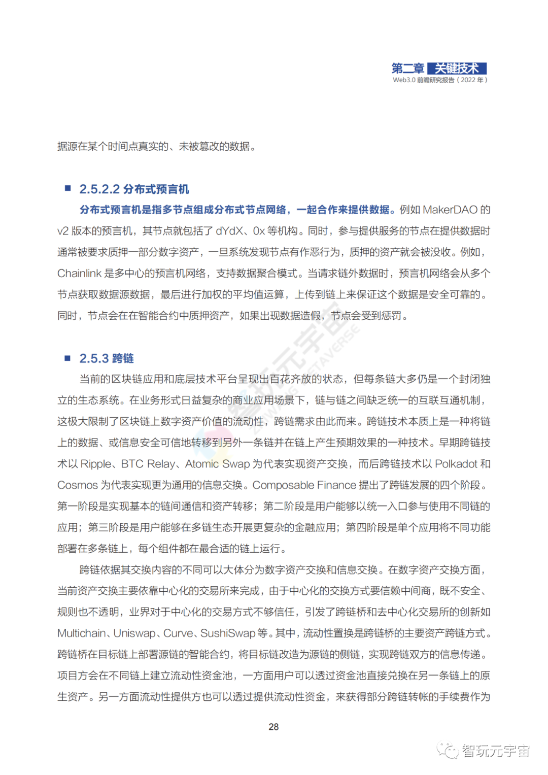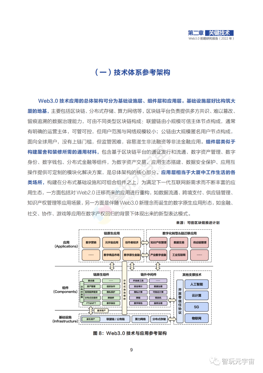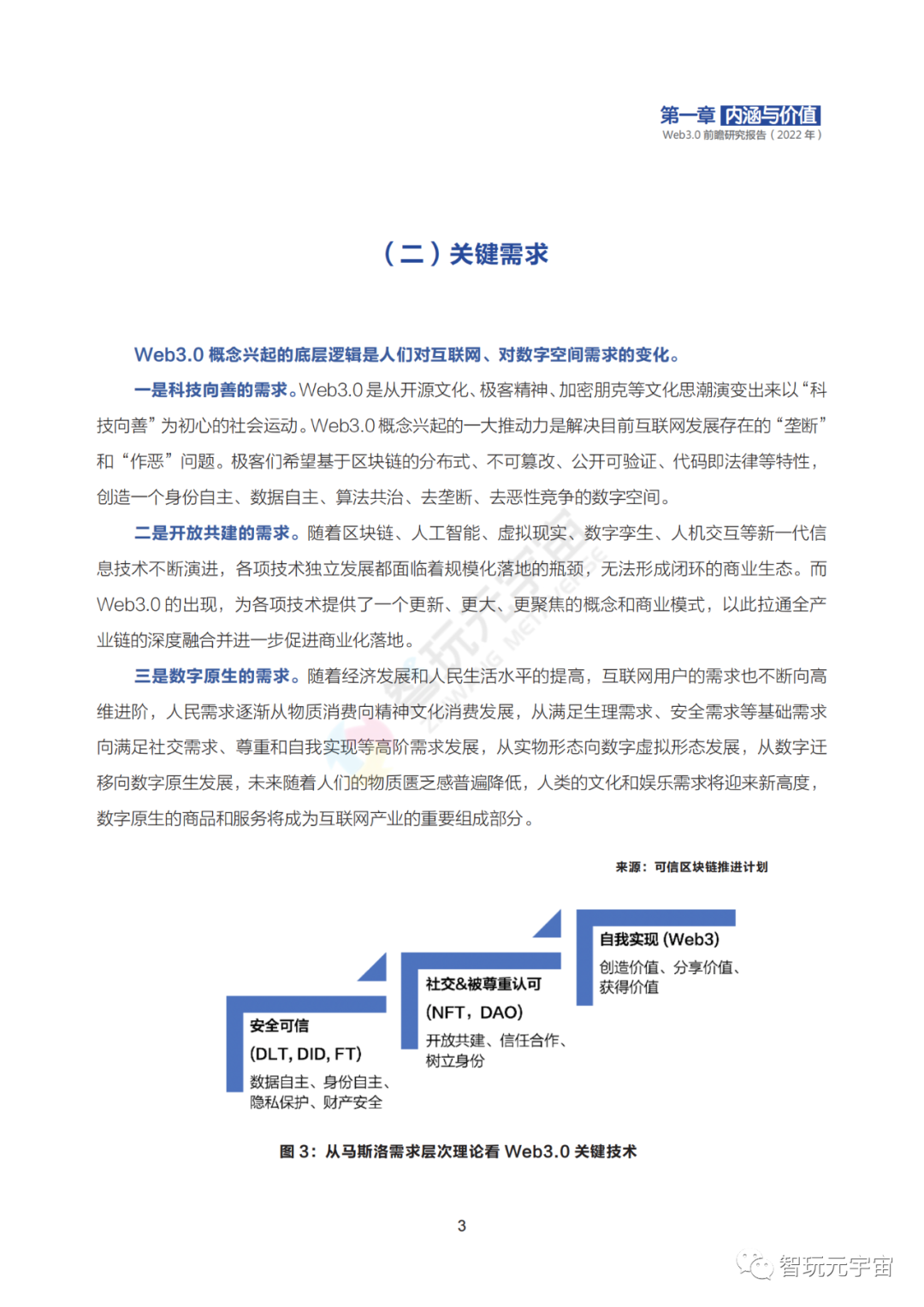 近年来,针对互联网行业发展面临的利益分配失衡、平台资源垄断、个人隐私泄漏等问题,全球兴起了新一轮互联网创新探索热潮,力图通过引入区块链、密码学等技术,来重构互联网发展未来图景,Web3.0 理念应运而生。总体来看,Web3.0 是以分布式技术重新解决互联网数据权属和价值表达的重要创新,有望从技术、产业、经济三方面优化互联网,进而推进生产方式、组织秩序和经济形态创新,但当前 Web3.0 仍存在发展前景备受争议、技术应用不成熟、金融衍生风险等关键问题。建议密切关注 Web3.0 发展动向,包容审慎推动相关技术创新与应用探索,积极稳妥探索我国 Web3.0 发展之路。为加强我国对 Web3.0 的前瞻研究和战略预判,可信区块链推进计划 (TBI)、大数据技术标准推进委员会(CCSA TC601)WG6 大数据区块链工作组、中国互联网协会(ISC)区块链技术应用工作委员会联合,组织成员单位深入研讨 Web3.0 相关技术细节和应用方向,共同编制研究报告。本研究报告综合分析国内外 Web3.0 政策和产业发展现状,详细介绍了 Web3.0 的关键技术组件和核心应用场景,为我国积极稳妥探索 Web3.0 发展之路提供参考建议。(一)发展理念从 Web1.0 到 Web2.0,再到 Web3.0 的演进,反映了互联网发展理念的升级。Web1.0是以向消费者提供信息服务为理念,其典型应用是以雅虎、新浪、搜狐为代表的门户网站,主要特征是门户网站主导创作并向消费者提供服务,用户只能被动地浏览文字和图片以及简单的视频内容。Web2.0 是以撮合劳动者和消费者为理念,其典型应用是以淘宝、美团、滴滴为代表的中介平台和以微信、微博、抖音为代表的内容社交平台,主要特征是平台作为中间商撮合多边市场,用户不仅是享受服务的消费者,同样可以成为提供服务的劳动者,在平台上交易劳动力、创造内容或者进行线上社交活动。Web3.0 是以去信任、去中介和数字资产化为理念,以区块链为底层关键技术,以数字生产和数字消费为主要经济形态的新一代互联网,其主要特征是利用分布式账本技术对 Web2.0 应用逻辑进行重构,利用区块链的可信协作、分布式执行、数据保护、资产转移等能力进一步整合信息流、业务流和价值流,以更加标准化的、更加简洁的链上智能合约来代替现有互联网应用服务,消除对中心机构的依赖。