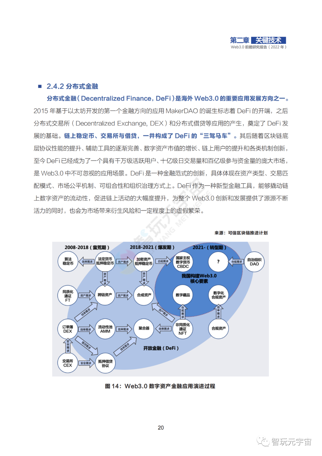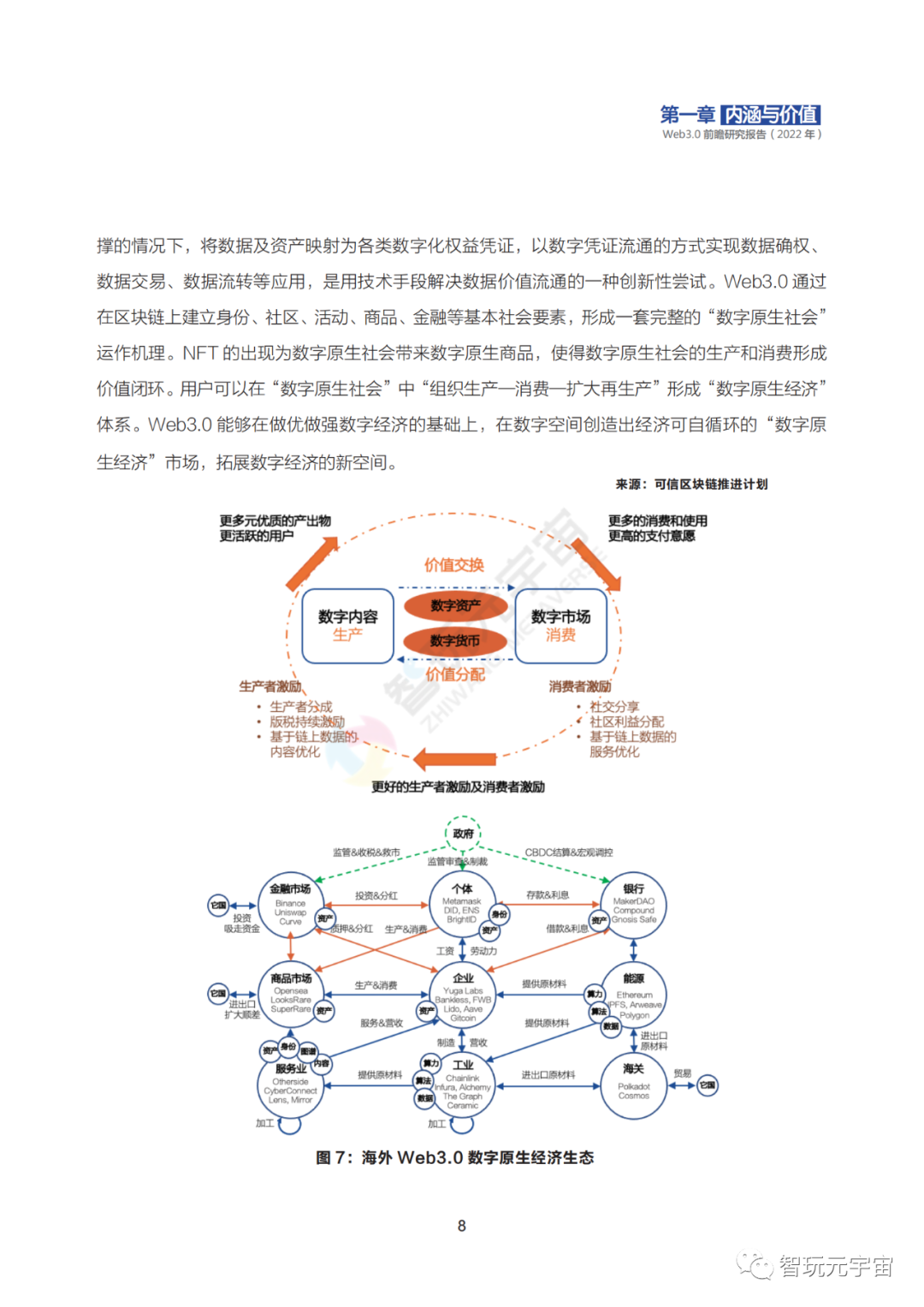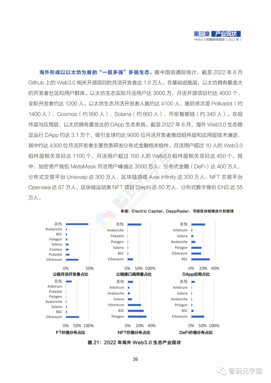 近年来,针对互联网行业发展面临的利益分配失衡、平台资源垄断、个人隐私泄漏等问题,全球兴起了新一轮互联网创新探索热潮,力图通过引入区块链、密码学等技术,来重构互联网发展未来图景,Web3.0 理念应运而生。总体来看,Web3.0 是以分布式技术重新解决互联网数据权属和价值表达的重要创新,有望从技术、产业、经济三方面优化互联网,进而推进生产方式、组织秩序和经济形态创新,但当前 Web3.0 仍存在发展前景备受争议、技术应用不成熟、金融衍生风险等关键问题。建议密切关注 Web3.0 发展动向,包容审慎推动相关技术创新与应用探索,积极稳妥探索我国 Web3.0 发展之路。为加强我国对 Web3.0 的前瞻研究和战略预判,可信区块链推进计划 (TBI)、大数据技术标准推进委员会(CCSA TC601)WG6 大数据区块链工作组、中国互联网协会(ISC)区块链技术应用工作委员会联合,组织成员单位深入研讨 Web3.0 相关技术细节和应用方向,共同编制研究报告。本研究报告综合分析国内外 Web3.0 政策和产业发展现状,详细介绍了 Web3.0 的关键技术组件和核心应用场景,为我国积极稳妥探索 Web3.0 发展之路提供参考建议。(一)发展理念从 Web1.0 到 Web2.0,再到 Web3.0 的演进,反映了互联网发展理念的升级。Web1.0是以向消费者提供信息服务为理念,其典型应用是以雅虎、新浪、搜狐为代表的门户网站,主要特征是门户网站主导创作并向消费者提供服务,用户只能被动地浏览文字和图片以及简单的视频内容。Web2.0 是以撮合劳动者和消费者为理念,其典型应用是以淘宝、美团、滴滴为代表的中介平台和以微信、微博、抖音为代表的内容社交平台,主要特征是平台作为中间商撮合多边市场,用户不仅是享受服务的消费者,同样可以成为提供服务的劳动者,在平台上交易劳动力、创造内容或者进行线上社交活动。Web3.0 是以去信任、去中介和数字资产化为理念,以区块链为底层关键技术,以数字生产和数字消费为主要经济形态的新一代互联网,其主要特征是利用分布式账本技术对 Web2.0 应用逻辑进行重构,利用区块链的可信协作、分布式执行、数据保护、资产转移等能力进一步整合信息流、业务流和价值流,以更加标准化的、更加简洁的链上智能合约来代替现有互联网应用服务,消除对中心机构的依赖。