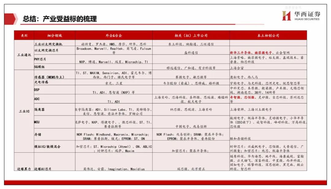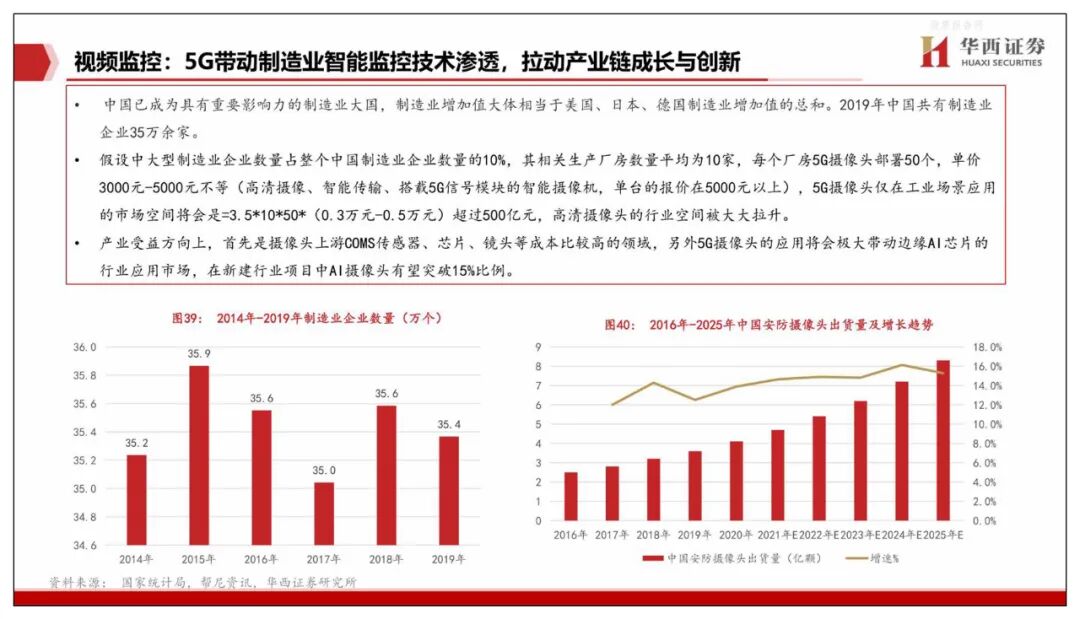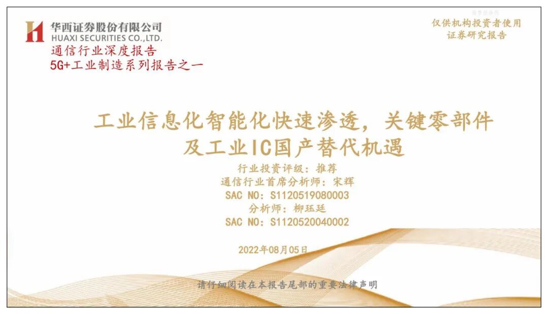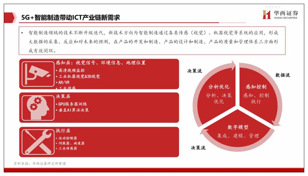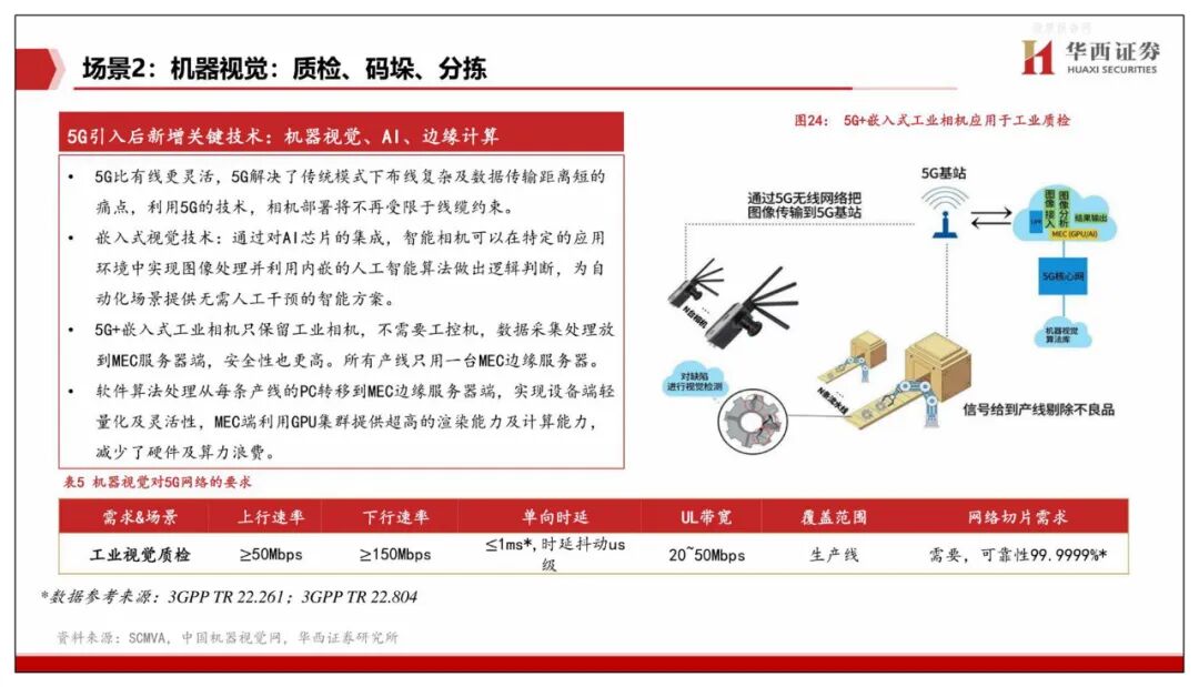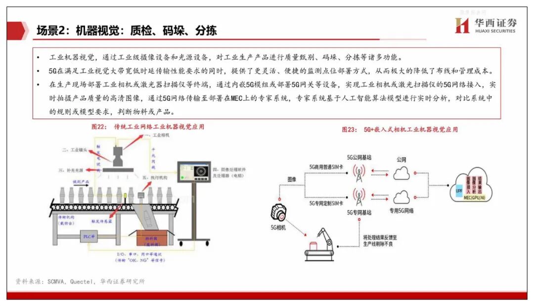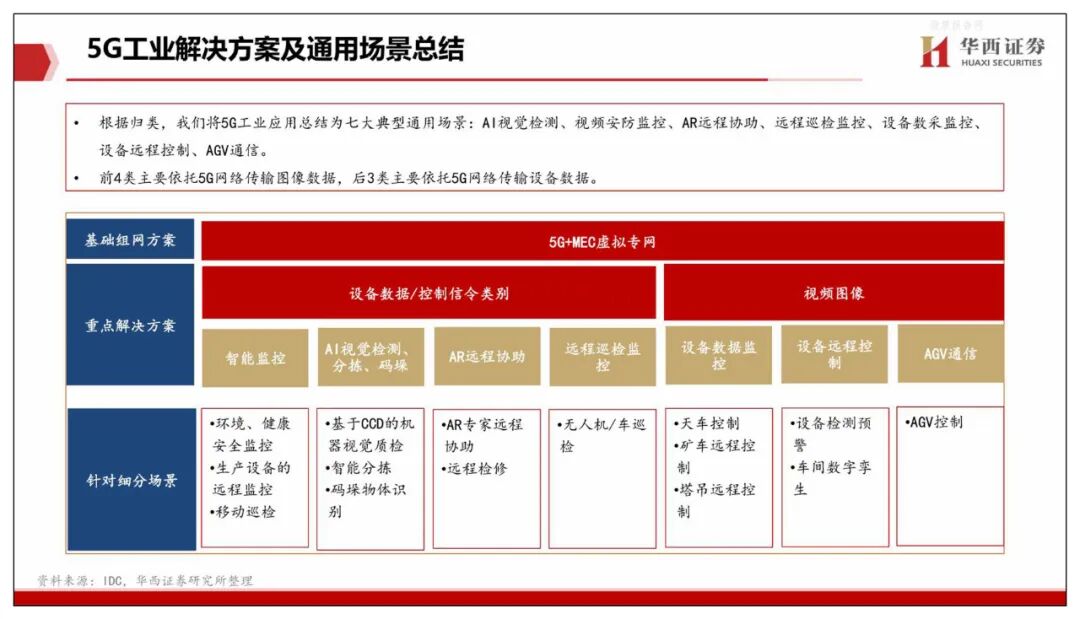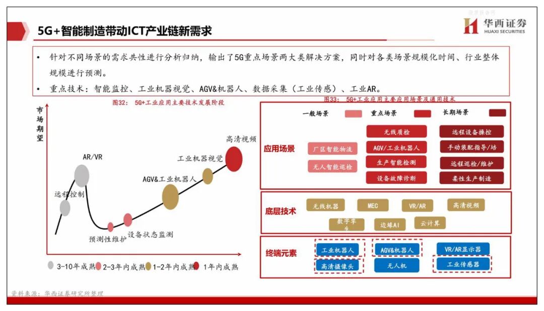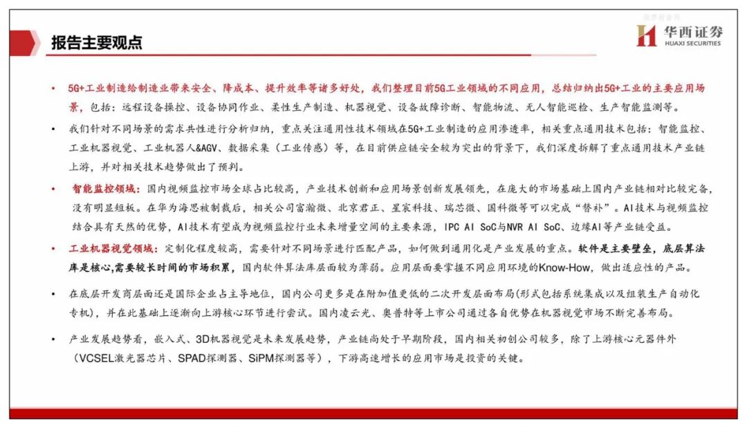 本文针对不同场景的需求共性进行分析归纳,重点关注通用性技术领域在5G+工业制造的应用渗透率,相关重点通用技术包括:智能监控、 工业机器视觉、工业机器人&AGV、数据采集(工业传感)等,在目前供应链安全较为突出的背景下,我们深度拆解了重点通用技术产业链 上游,并对相关技术趋势做出了预判。
